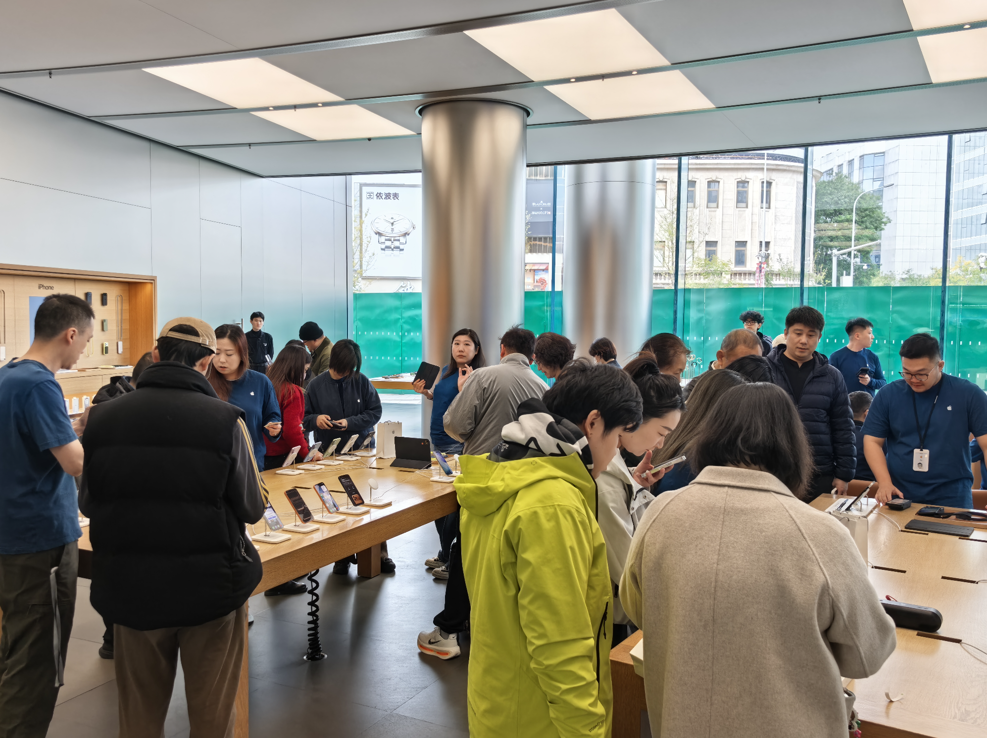 作者在9点50左右到达Apple Store王府井门店,相比较iPhone17系列发售之时,虽然没有出现排长队的现象,但人也不少。10点过后,进店的人也越来越多,一部分是取货的,而大多数都是来体验iPhone Air的。