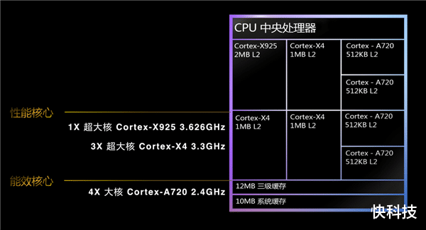 CPU架构则坚持“全大核”设计,以榜单主力型号为例,其采用1×3.25GHz Cortex-A725超大核+3×3.0GHz Cortex-A725大核+4×2.1GHz Cortex-A725大核的八核配置,无小核拖累性能的短板,多核运算效率显著提升。