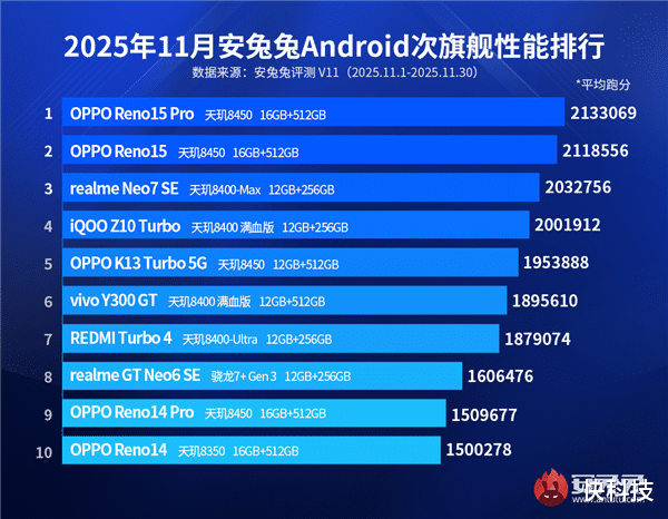 其中OPPO Reno15 Pro、OPPO Reno15更是凭借该系列芯片突破211万分跑分,稳居冠亚军,碾压式领先竞品。